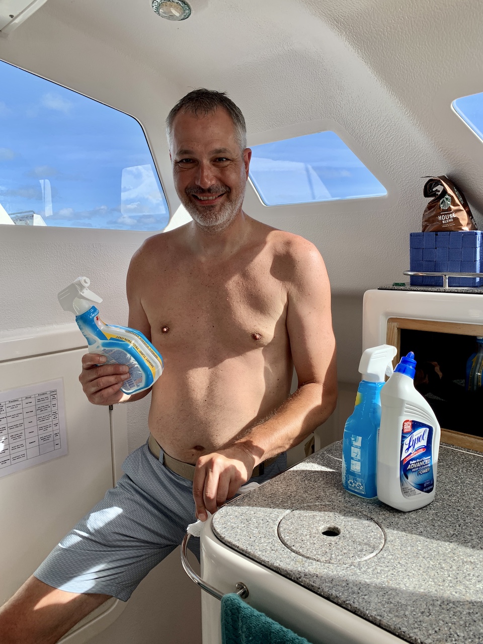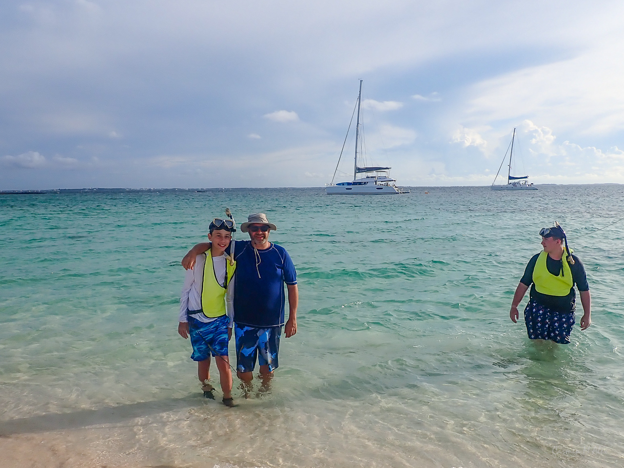 While we’re putting masks and snorkels together and defogging masks, the troop on Viento Azul starts swimming over. When the troops packed at home, all snorkel gear went in one bag. We have that bag onboard. Suddenly, we’re surrounded by intruders aiming to board our ship. Our troop is ready for the assault, though, and they push back immediately. Eventually, we make peace and allow the invaders to come aboard and visit with us. Soon all is sorted out and we start thinking about dinner.
