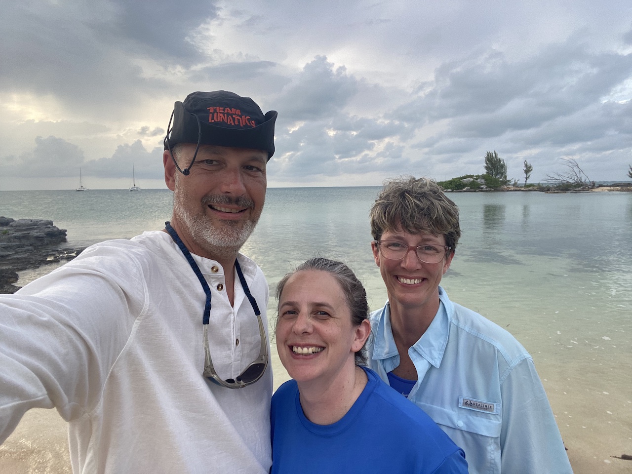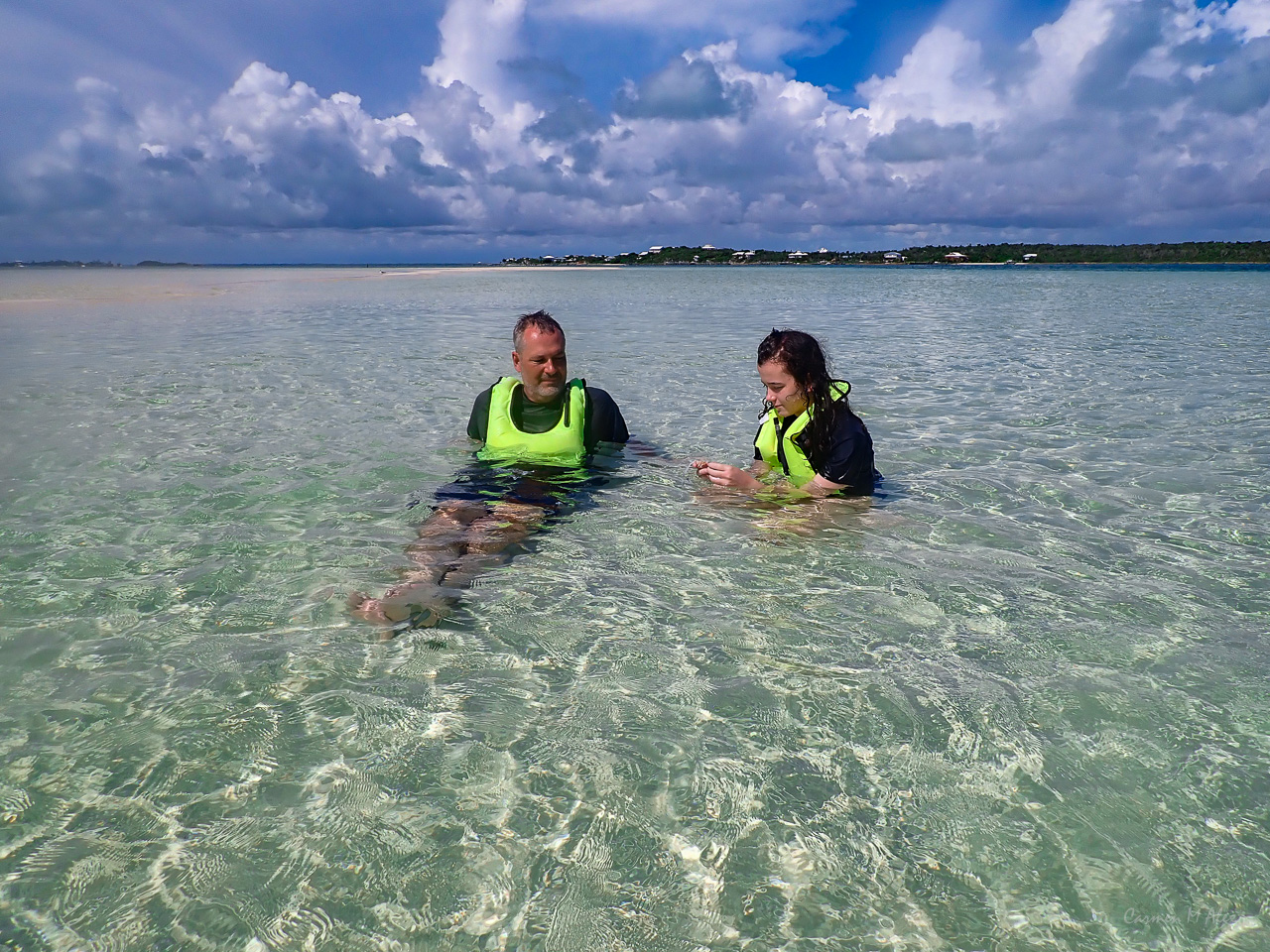 The wind is coming from the east, so we motor across to Great Guana to snorkel a wreck collection (barge, power boat, golf cart). Our crew discovers treasure there in the form of a beautiful conch.