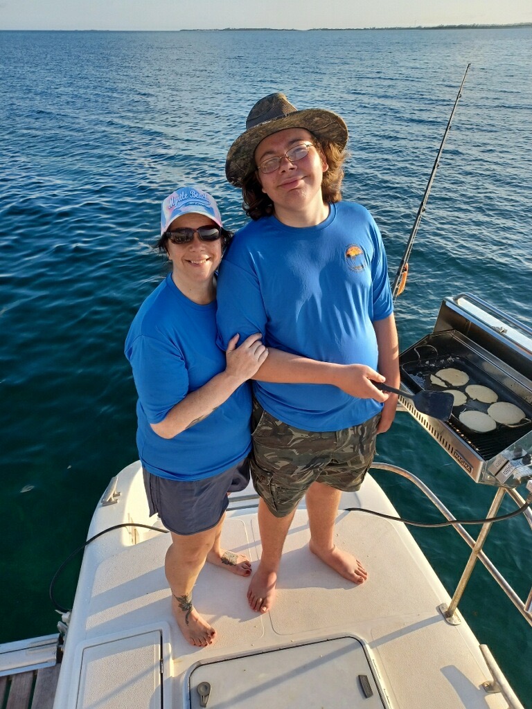 At around 11 am, AJ got a bite but he was busy filling his water bottle. Brennon jumped up and took over, reeling in the fish. Sam studied the fish ID card and identified the catch as a large mutton snapper.