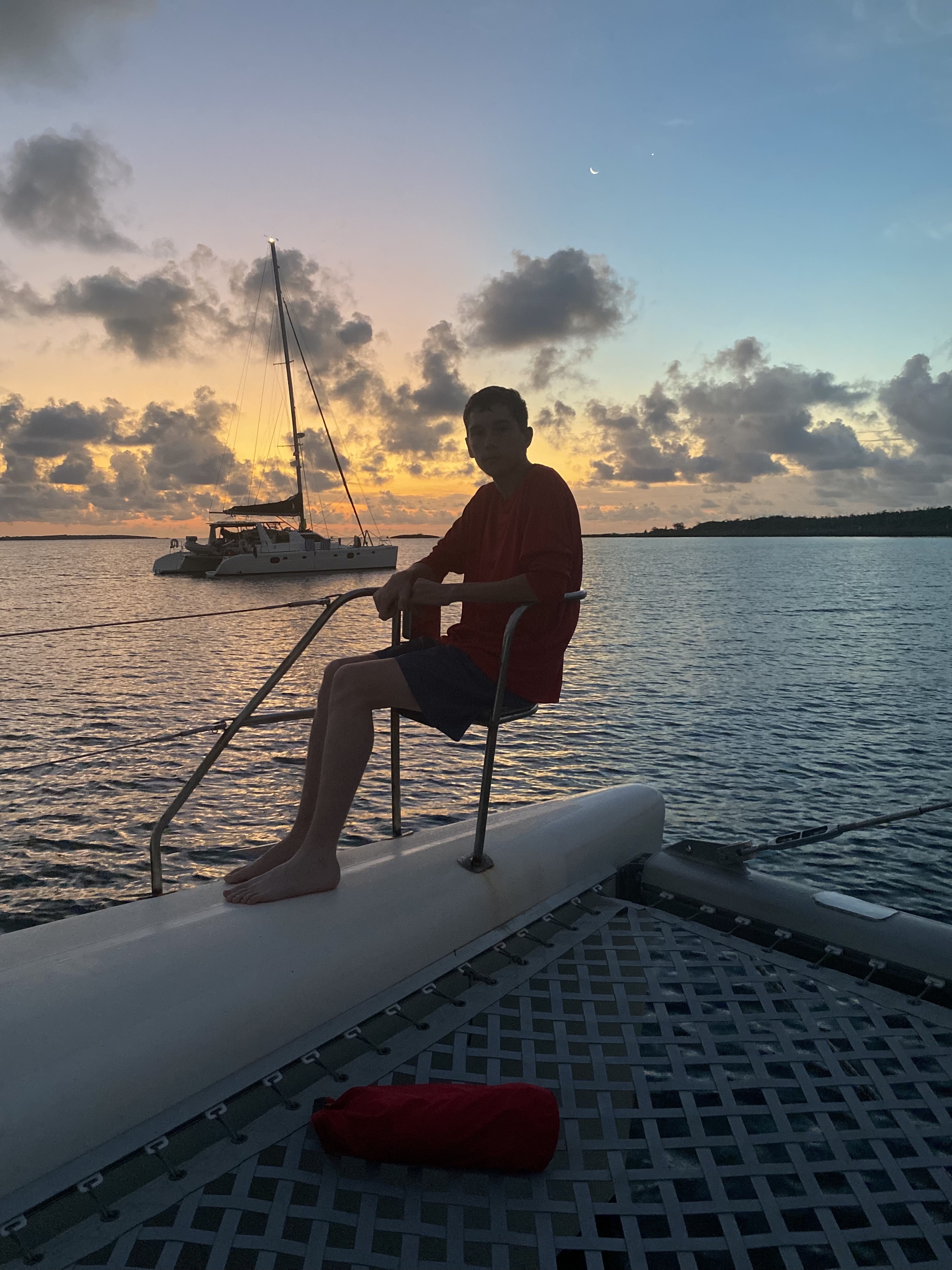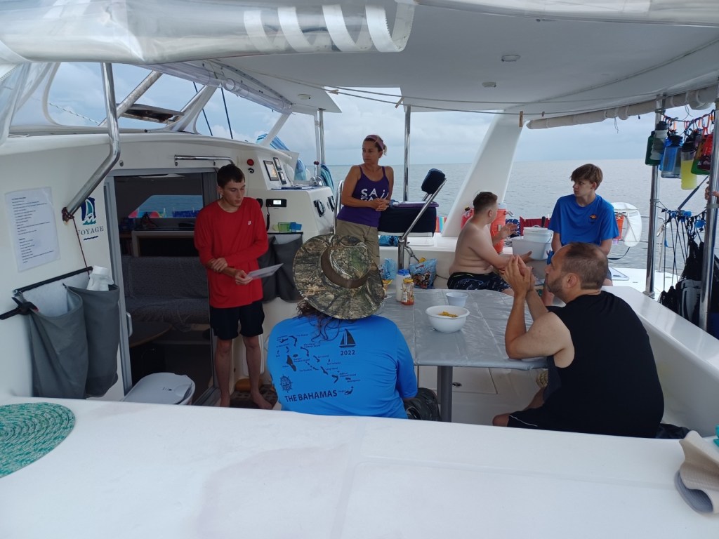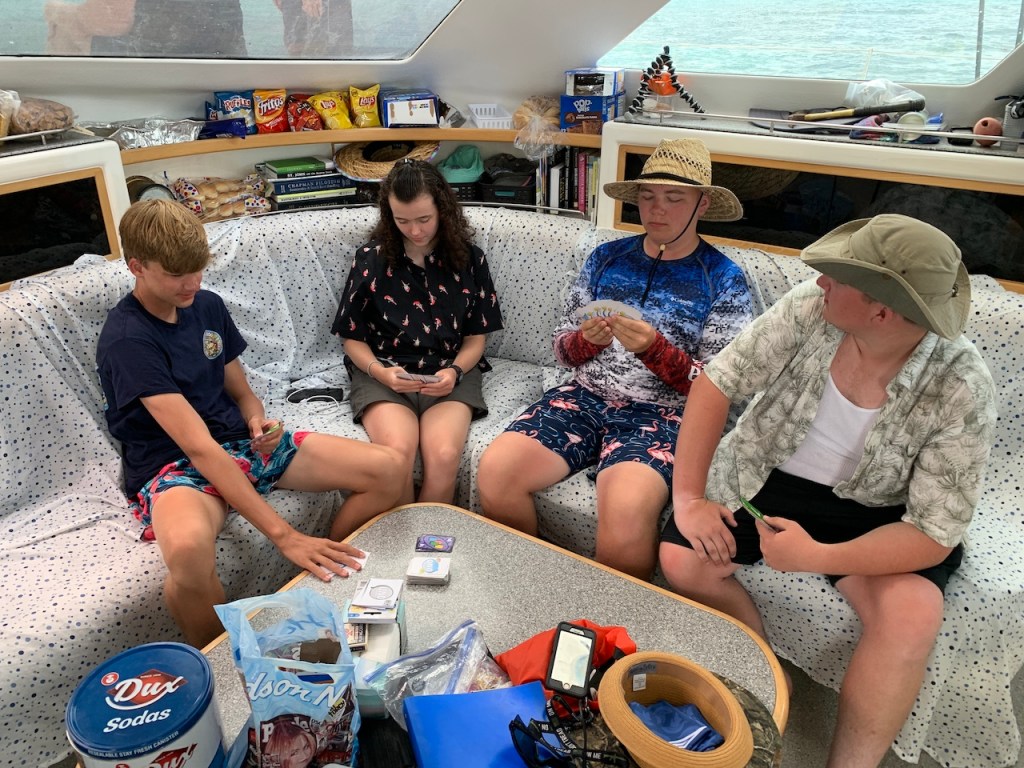We can’t shake the weather, so we decide to head to Treasure Cay early, where we’ll spend the night. On the way, Tommy, Sam, Brennan, and Maxx play UNO.