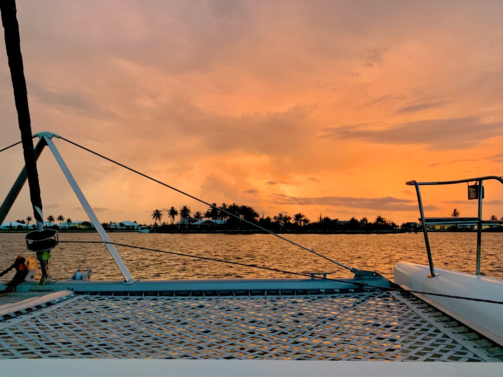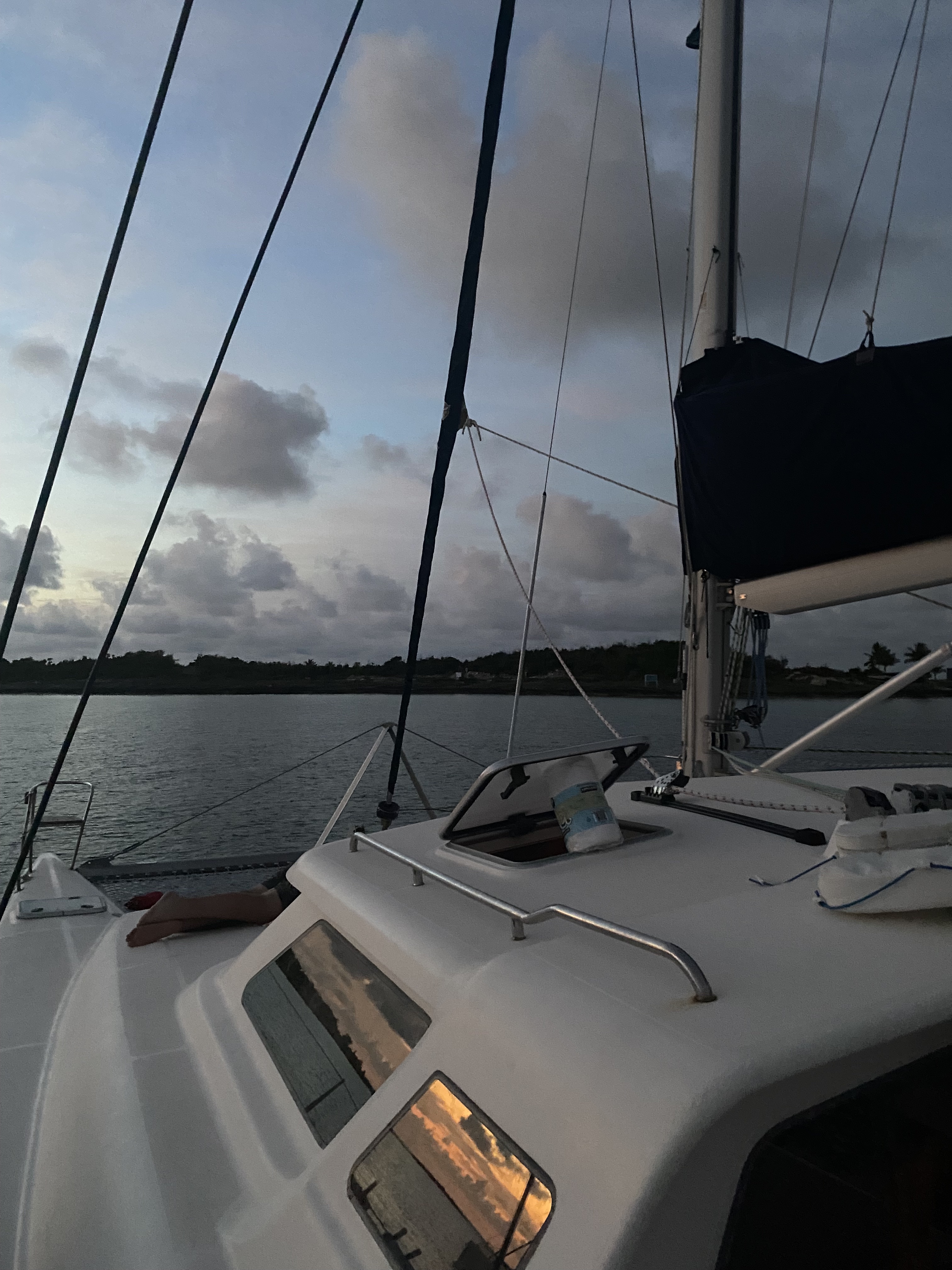 The troop is up pretty early. I hear voices in front of my hatch at 6:30 am and I pop out to see who woke me. Across the bow, a big red fireball is rising in the eastern sky. Beautiful.