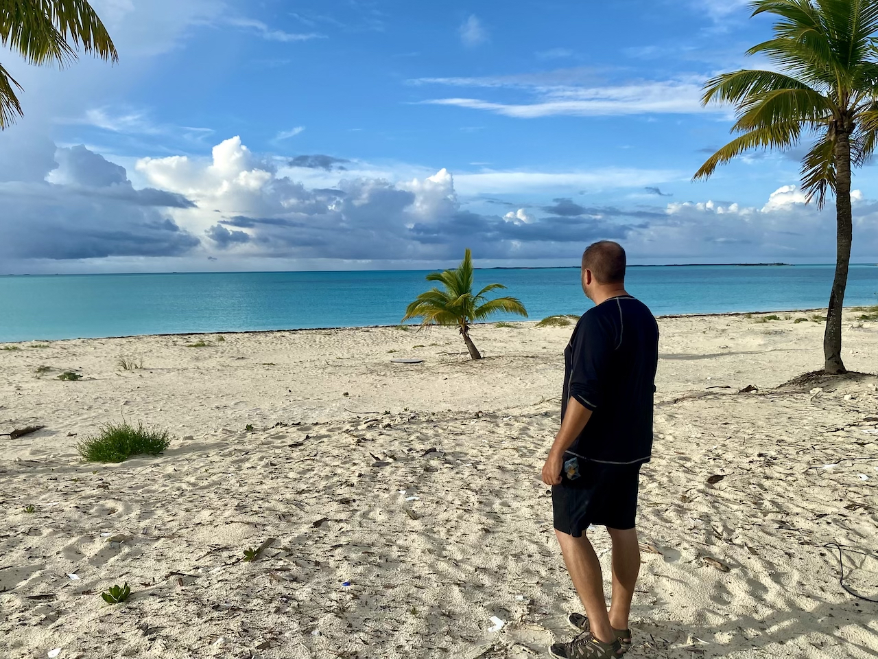 We plan on spending the night off the “low spot” (aka the “Narrows”) on northern Man-O-War Cay. Capt. Steve dinghies everyone (with a slight delay) to shore.