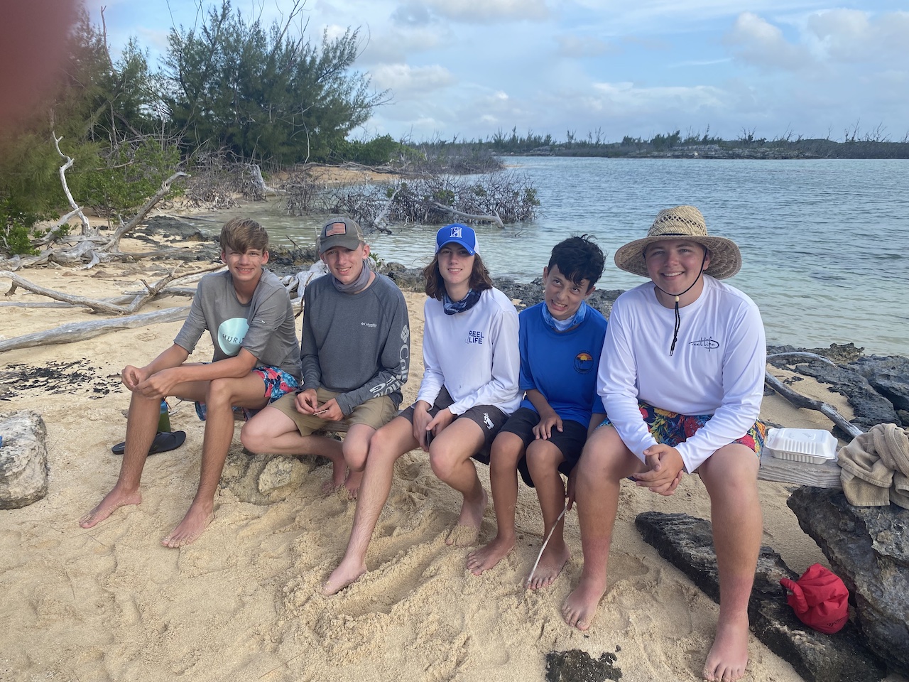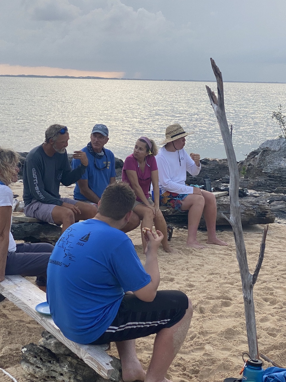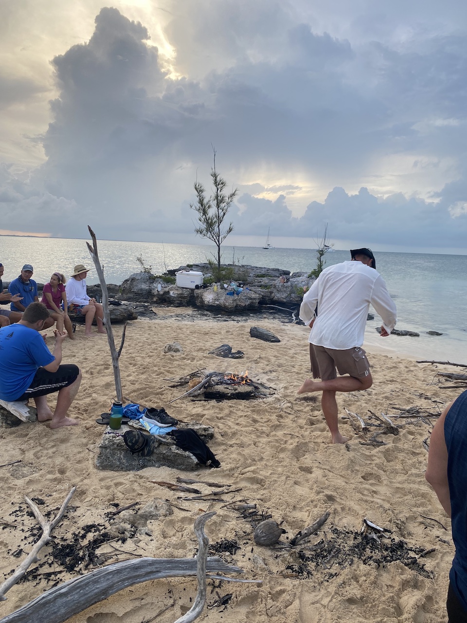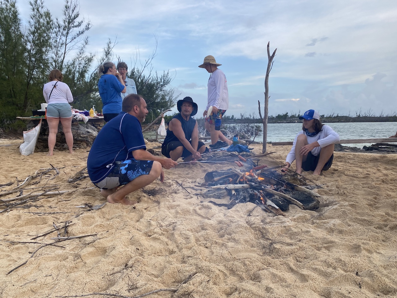 In the afternoon we sailed across the Sea of Abaco again and anchored at Water Cay. Capt. Steve dinghied the crew over to the island where the first order of business was to make a fire.
