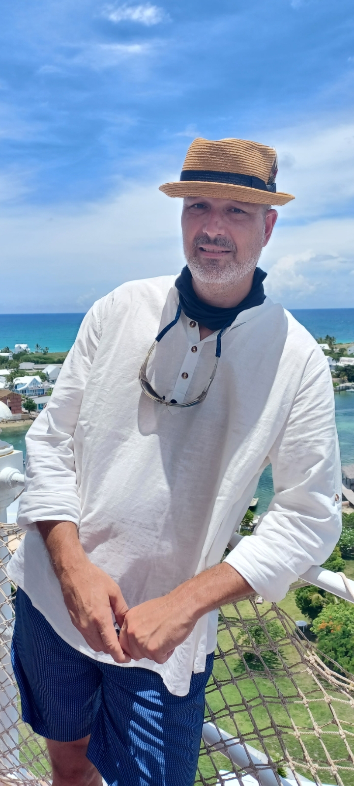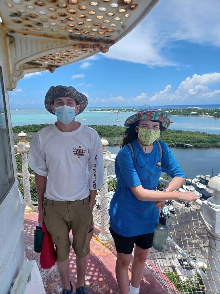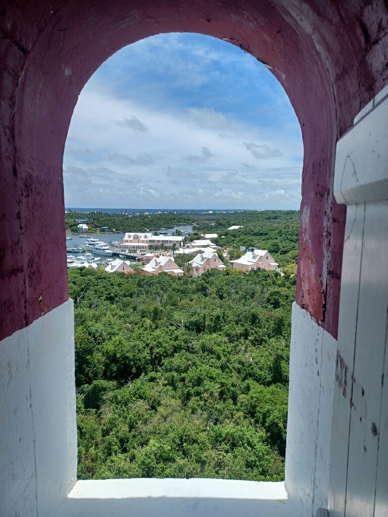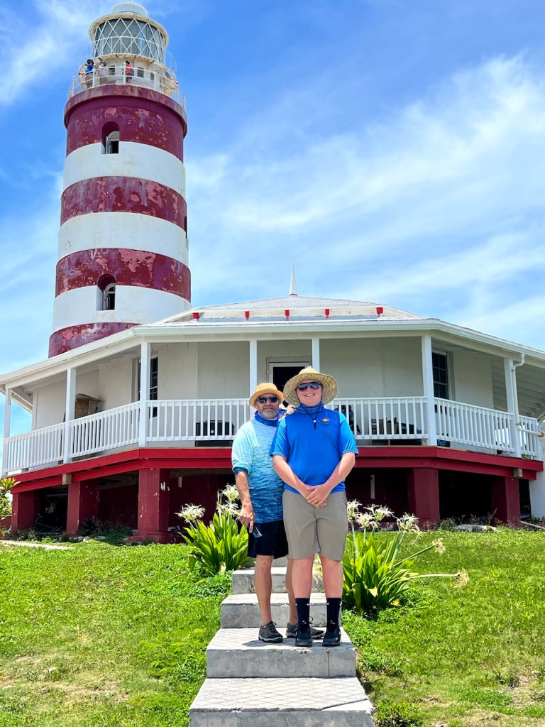 We get underway and motor north to the other end of Elbow Cay where we anchor off Hope Town Harbour. Capt. Steve dinghies the crew to the lighthouse pier and the crew walks up the hill to climb the Elbow Reef Light.