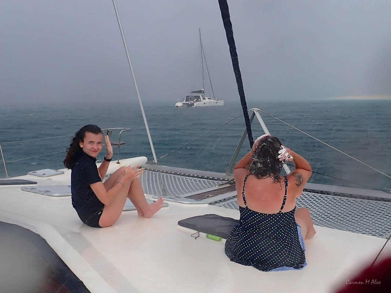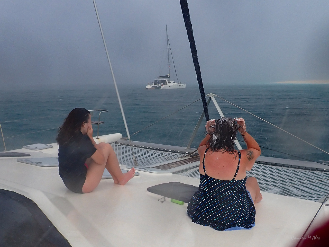 Sam and Jenn take advantage of the rain–it’s the perfect time for a freshwater shower.