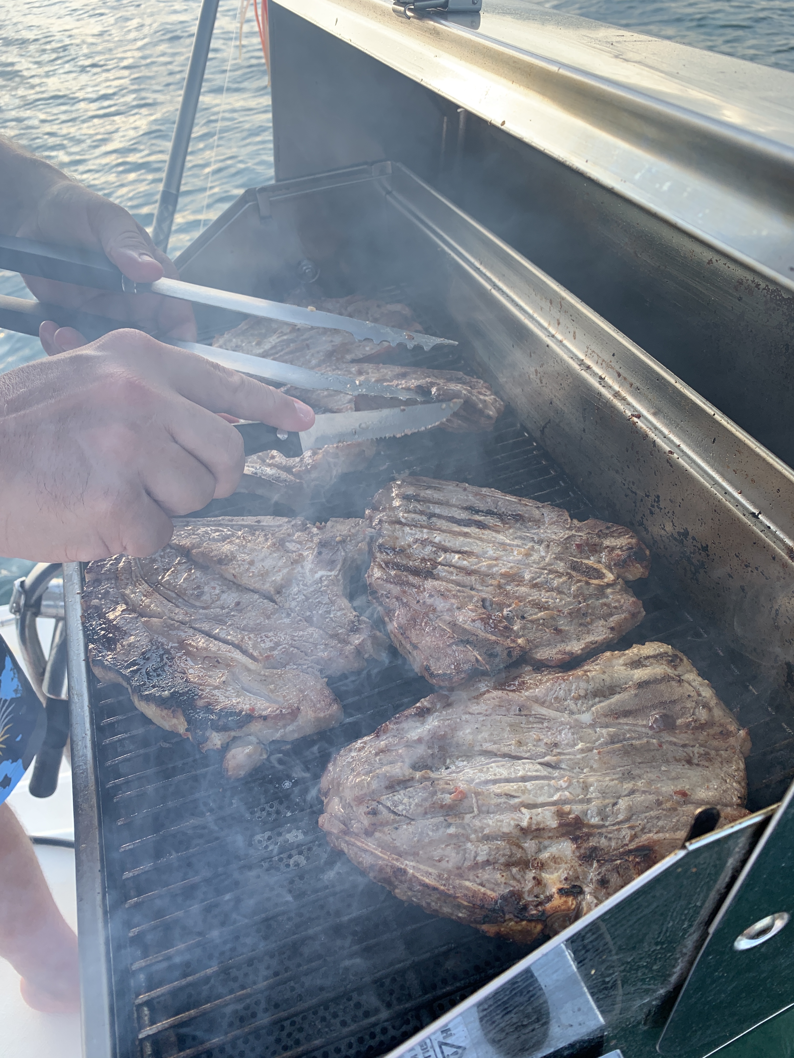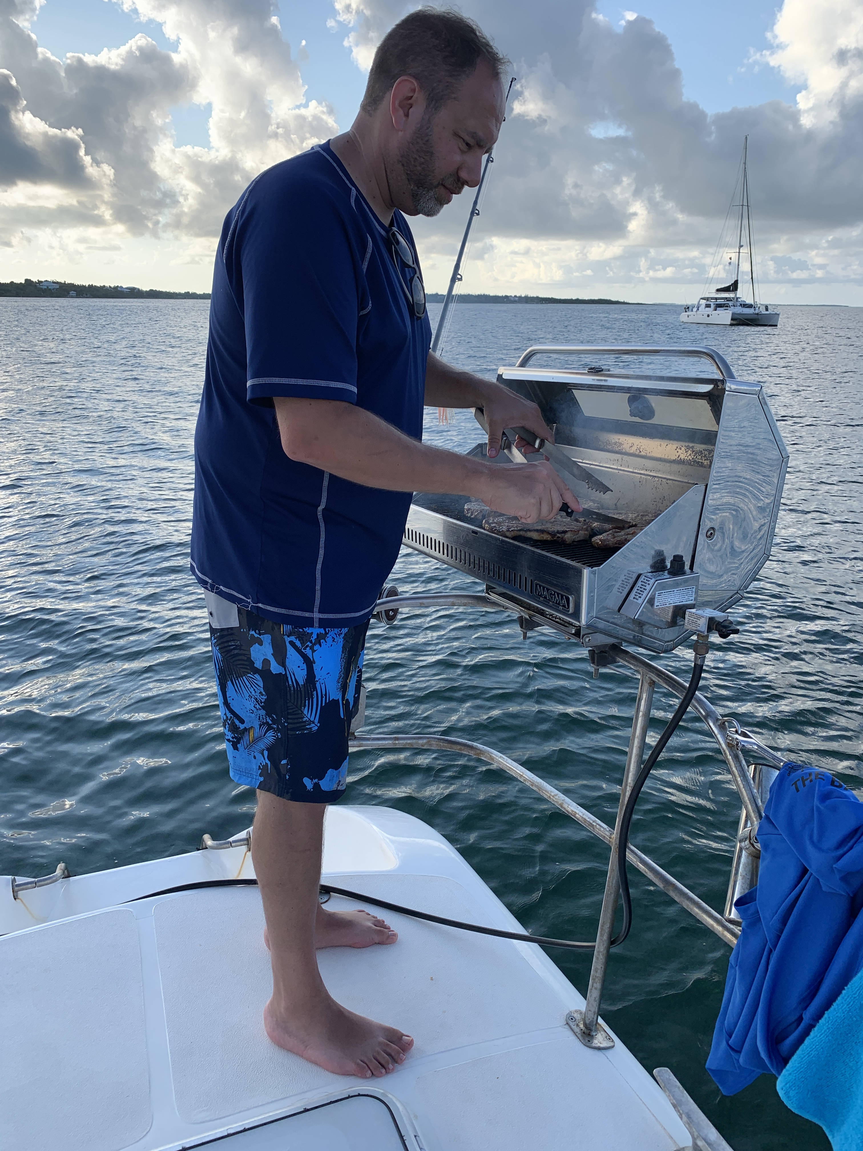 And … it’s Taco Tuesday!! Sara and Jenn and Tommy and AJ are on duty. The dinghy gets back just in time to eat.