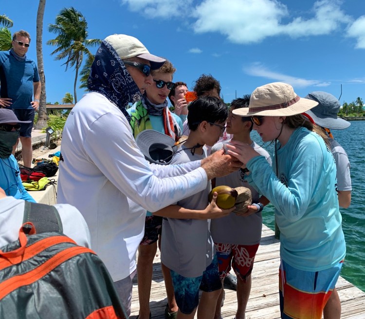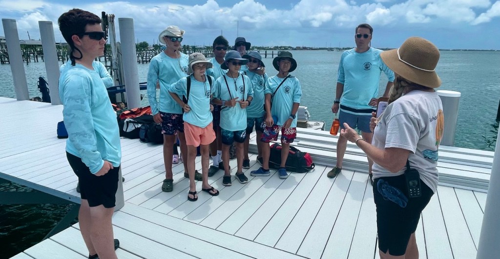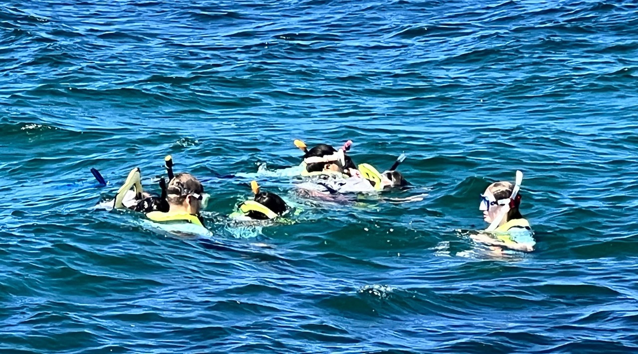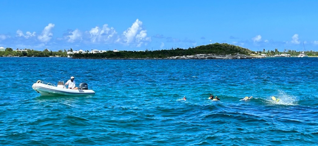 Captain Steve is following the scouts in the dinghy to keep random power boats away and to guide the snorkelers in the right direction.
