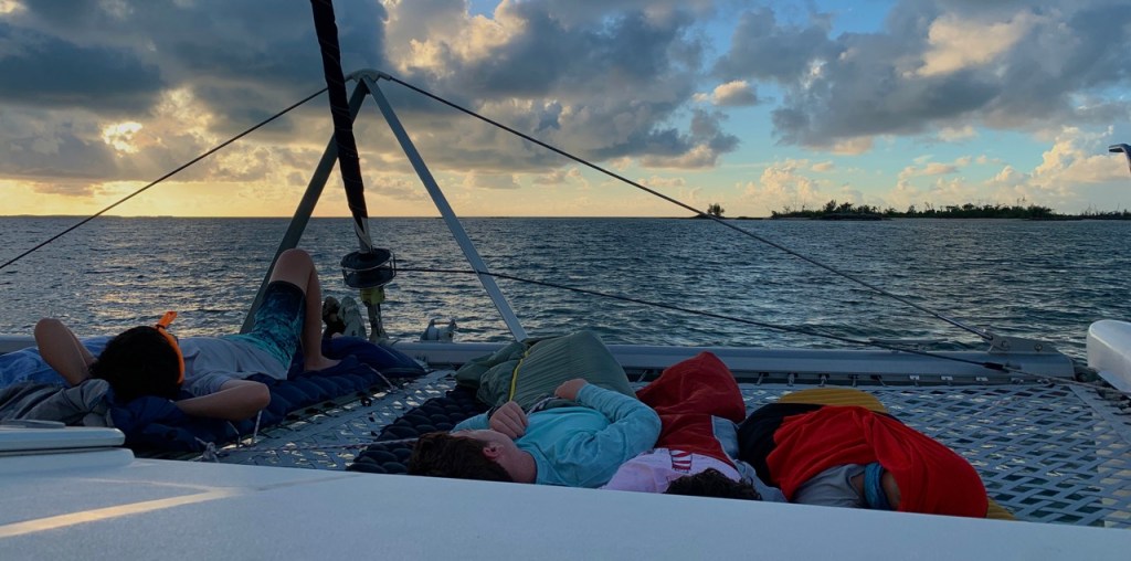 Owen and Oliver stayed on the settee, Auggie and Ambrose were on the floor next to the counter, JP picked the galley, Wesley was under the table in the cockpit, Oliver and Alex on the cockpit benches, and the adults on the cockpit benches (Shawn and CP) or the bunks (Mike and Darren).
