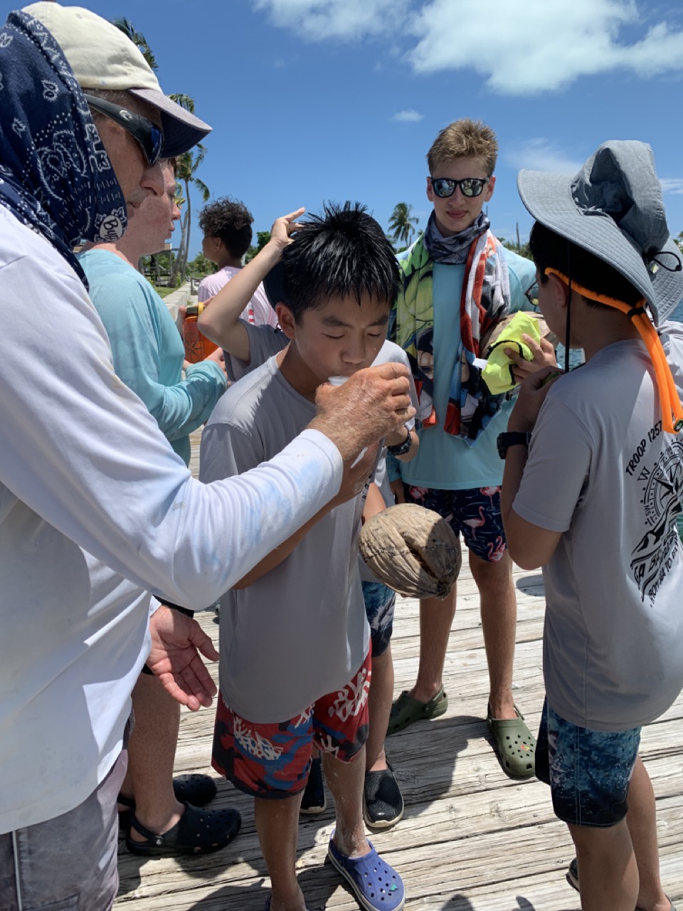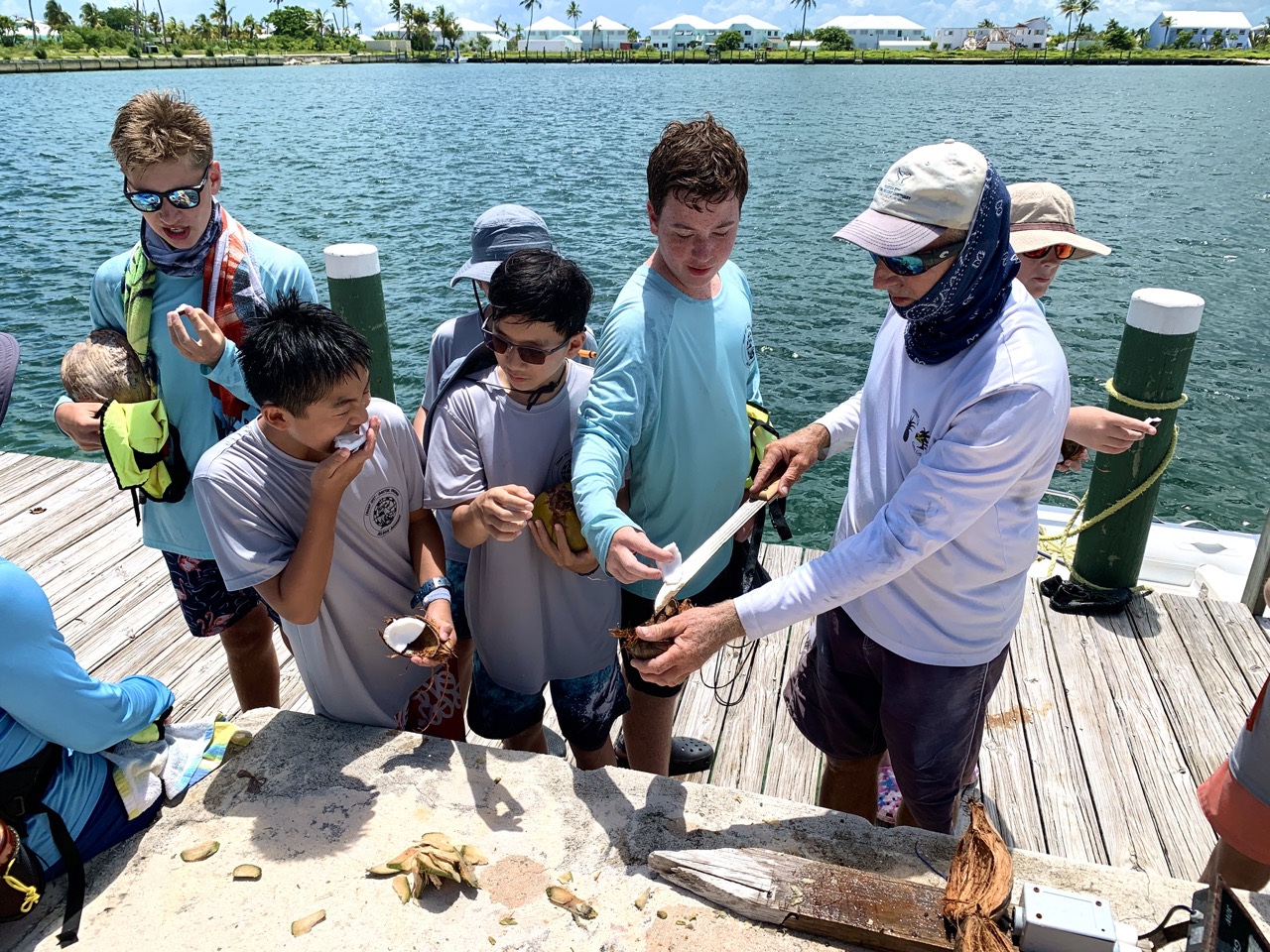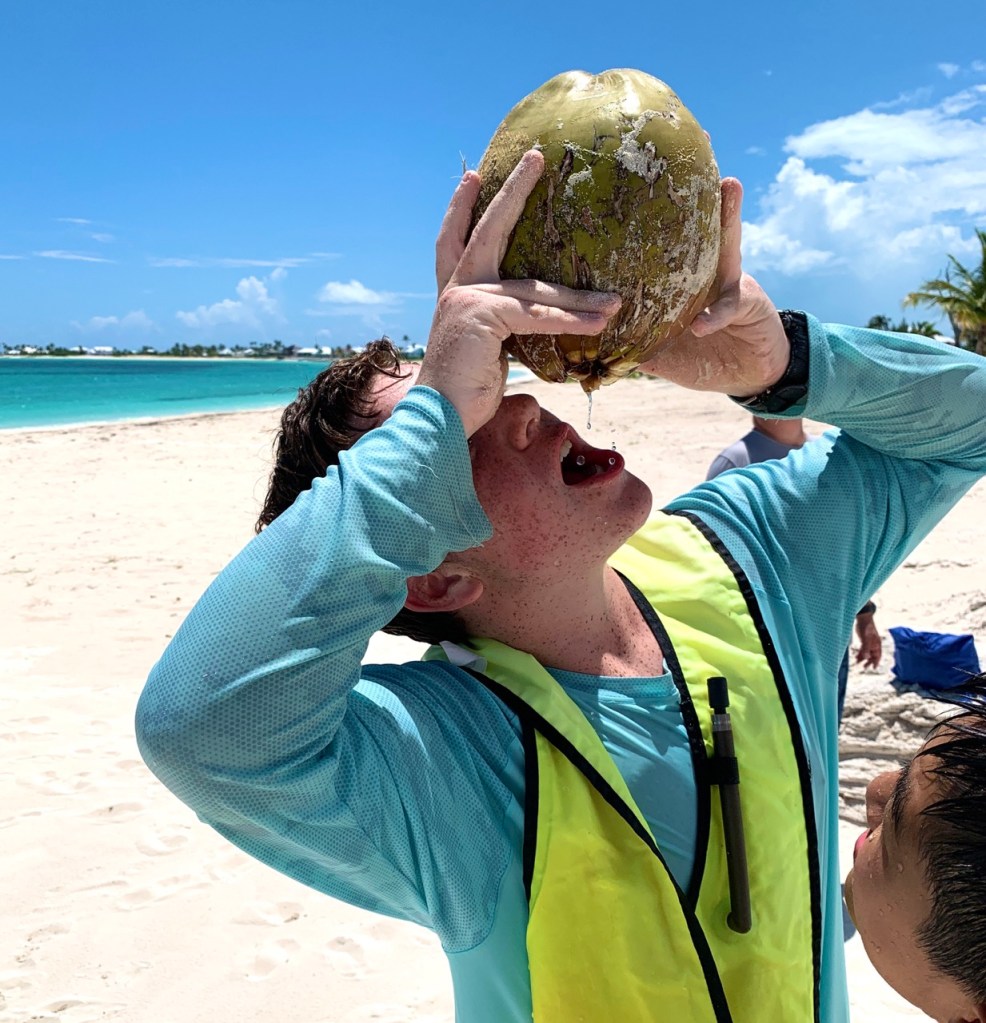 On the way back to the dinghy, Alex smashes his coconut open and tries to drink the water.