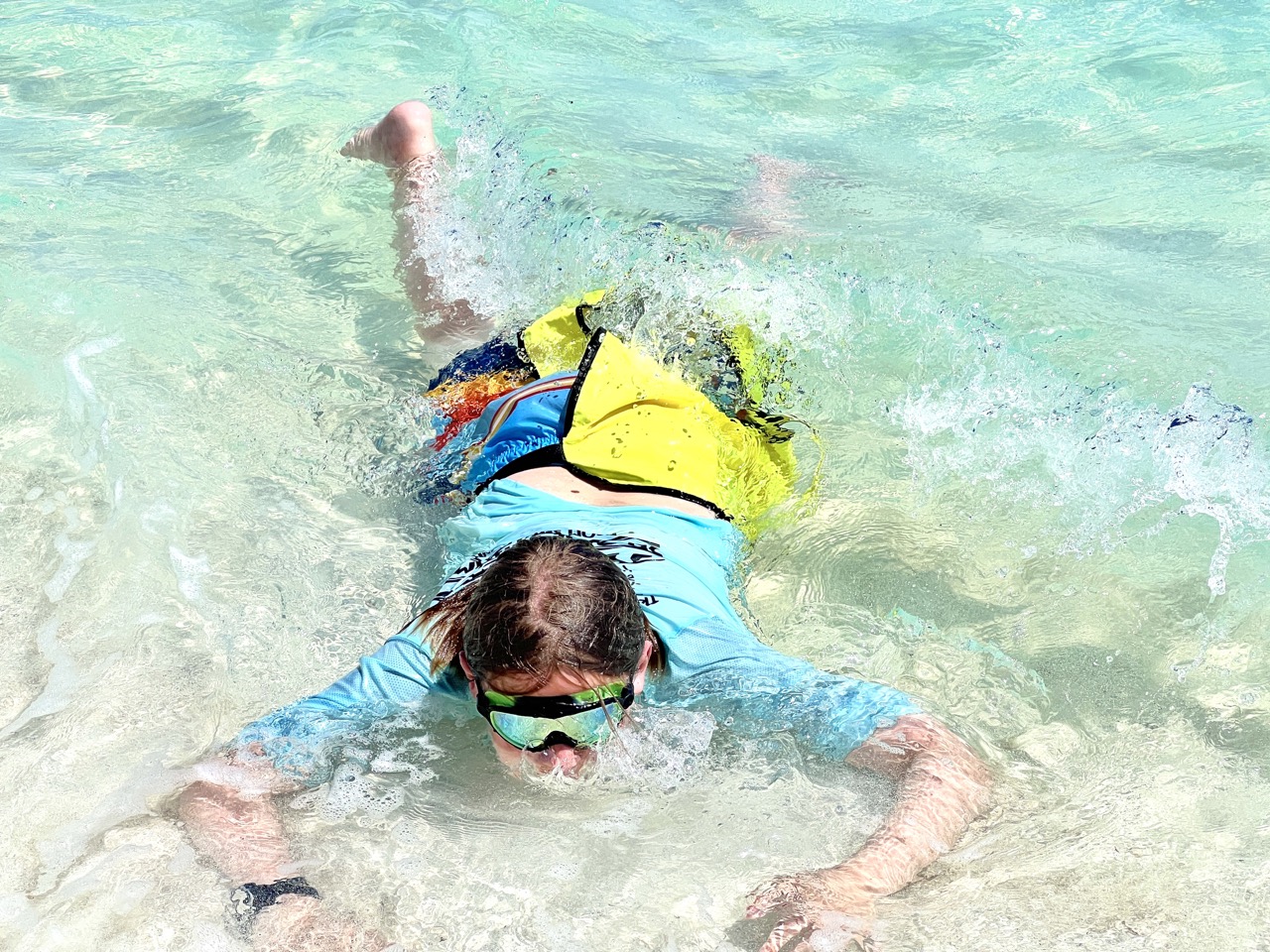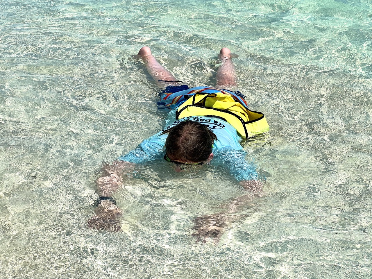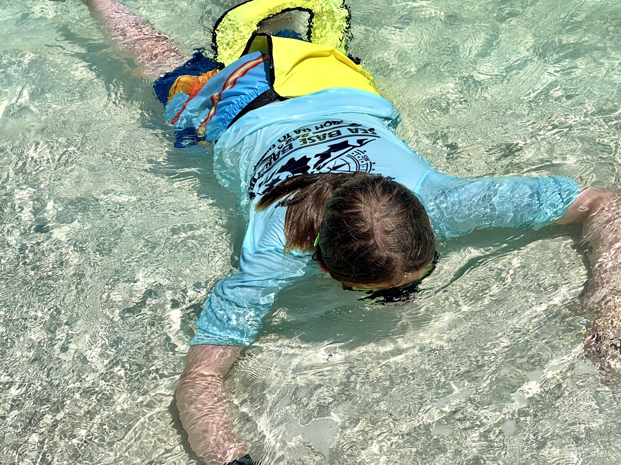 Our first stop is always Matt Lowe Cay where we do the mandatory swim test. Afterward, everyone put their snorkel gear on and jumped back in to get comfortable snorkeling in the ocean.