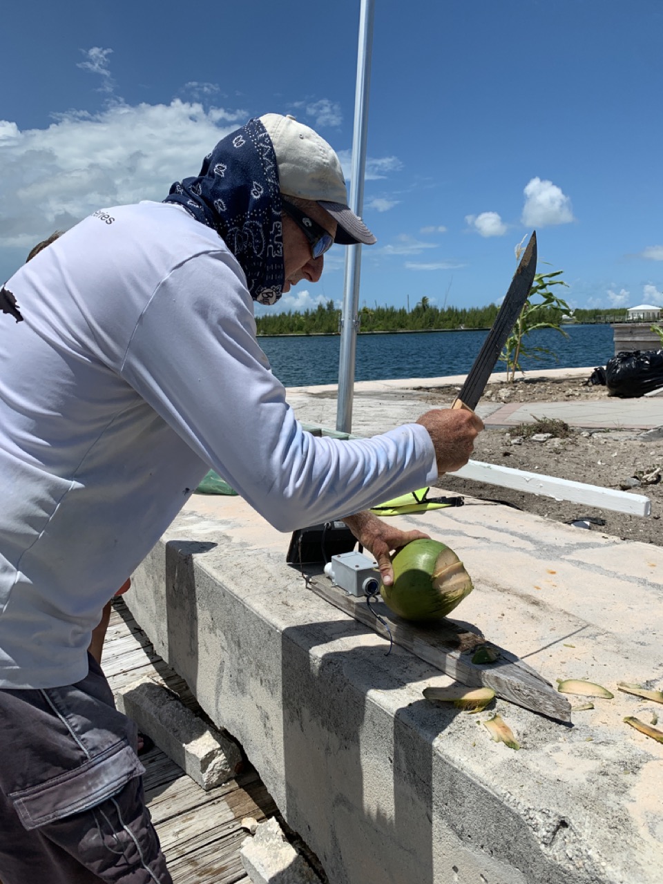 At the pier, Captain Steve swings the machete and opens the rest of the coconuts: green for coconut water and brown for coconut meat.